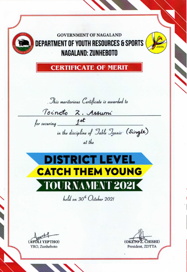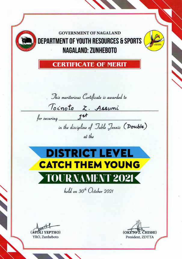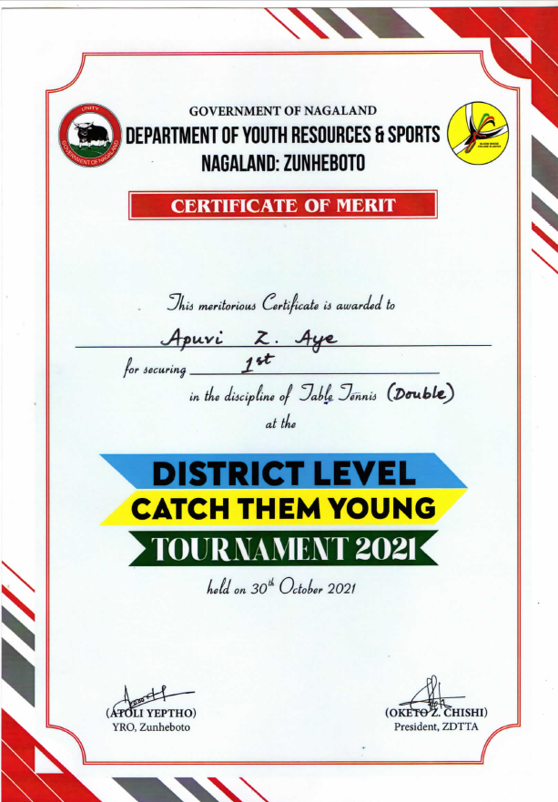 Khelo India Table Tennis CentreBy ahupe.foundation / October 8, 2025 Runners up state junior doubles Runners up state junior singles Nisuvi A Awomi receiving 2nd position certificate from Director YRS Toinoto and Asuvi receiving their 3rd position certificate from Director YRS